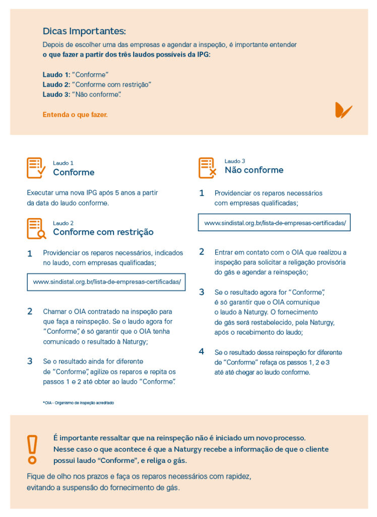 A Inspeção Periódica de Gás – IPG ou autovistoria, que será realizada a cada 5 anos, é a visita na qual os itens que fazem parte de uma instalação interna de gás são inspecionados e o cliente recebe um laudo dizendo se esta instalação está de acordo ou não. Caso não esteja, o cliente será orientado a realizar os reparos contratando empresa de manutenção no mercado. A Naturgy não faz esse tipo de serviço.